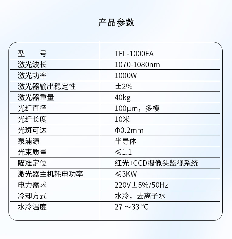 環(huán)境溫度:攝氏4度-攝氏32度。設備運行時,環(huán)境溫度不可以超過攝氏32度,因為激光電源部分,功率很高,一些功率器件運行時發(fā)出熱量需要及時散發(fā)出去,而環(huán)境溫度太高會導至不能正常散熱,會引起整個系統(tǒng)的工作不穩(wěn)定,甚至損壞。而冬天的時候,需要嚴防冷卻水結冰,因為激光晶體、氙燈、聚光腔都充滿了水,結冰會直接導致這些器件的損壞。冬天時如長時間不運行情況下,將腔內的水排空;如再開機前,先重新加水,打開電源空氣開關,先行主機不開,只開水機空機運行10分鐘,等水溫回復到攝氏4 度以上,再開主機。(強烈要求不能將設備放于室外或者低溫結冰的情況下使用,否則極易損壞設備)